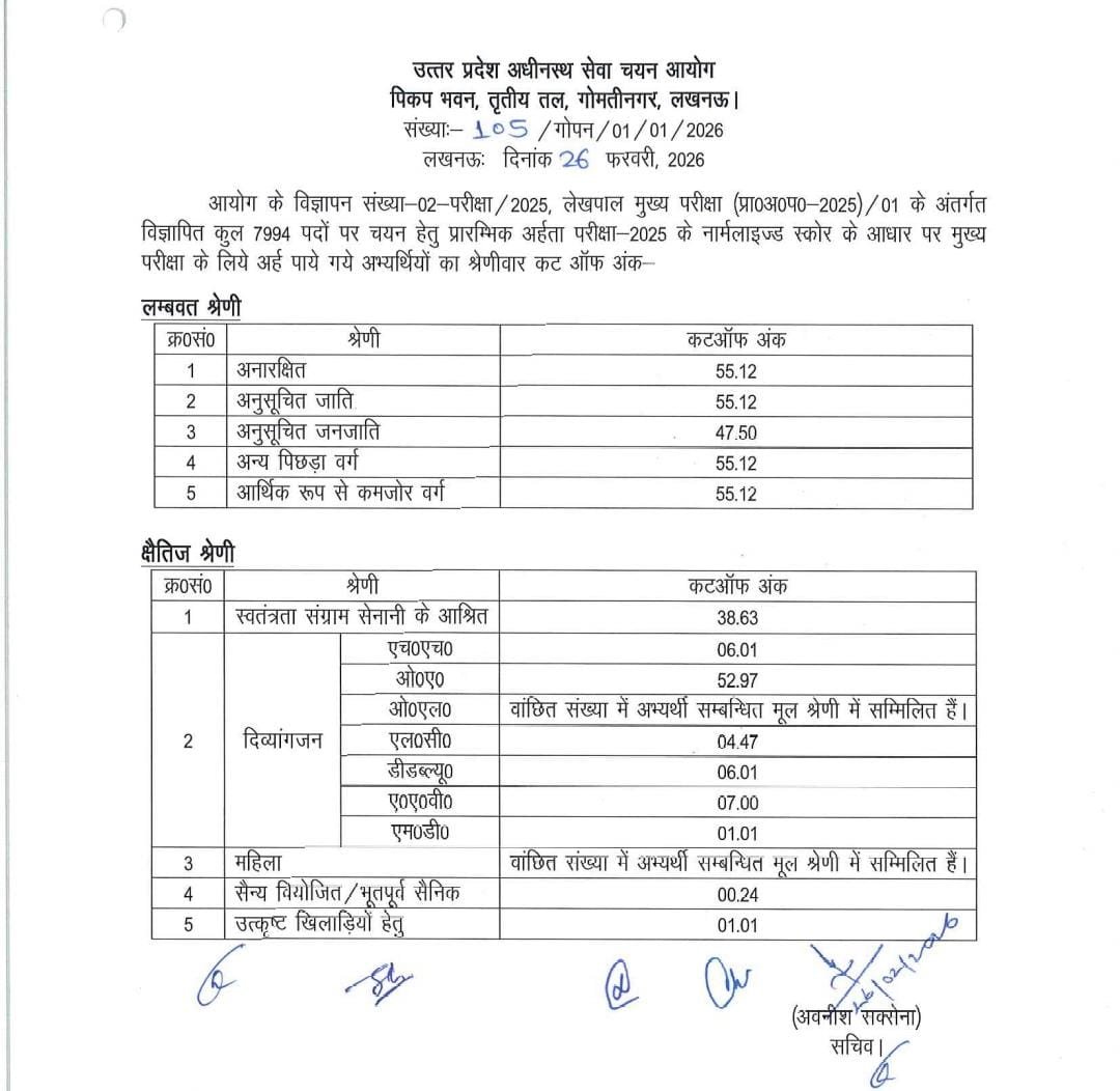 उत्तर प्रदेश अधीनस्थ सेवा चयन आयोग (UPSSSC) ने बहुप्रतीक्षित लेखपाल मुख्य परीक्षा के लिए श्रेणीवार (Category-wise) कटऑफ जारी कर दी है। यह कटऑफ प्रारंभिक अर्हता परीक्षा (UPSSSC PET) के नॉर्मलाइज्ड स्कोर के आधार पर तैयार की गई है। कुल 7,994 पदों के लिए 3,66,712 अभ्यर्थियों को मुख्य परीक्षा के लिए शॉर्टलिस्ट किया गया है। इसका मतलब है कि मुख्य परीक्षा में एक पद के लिए लगभग 46 उम्मीदवारों के बीच कड़ा मुकाबला होगा। जो भी अभ्यर्थी इस भर्ती प्रक्रिया का हिस्सा हैं, वे UPSSSC की आधिकारिक वेबसाइट (upsssc.gov.in) पर जाकर अपना स्कोर और एलिजिबिलिटी स्टेटस चेक कर सकते हैं।